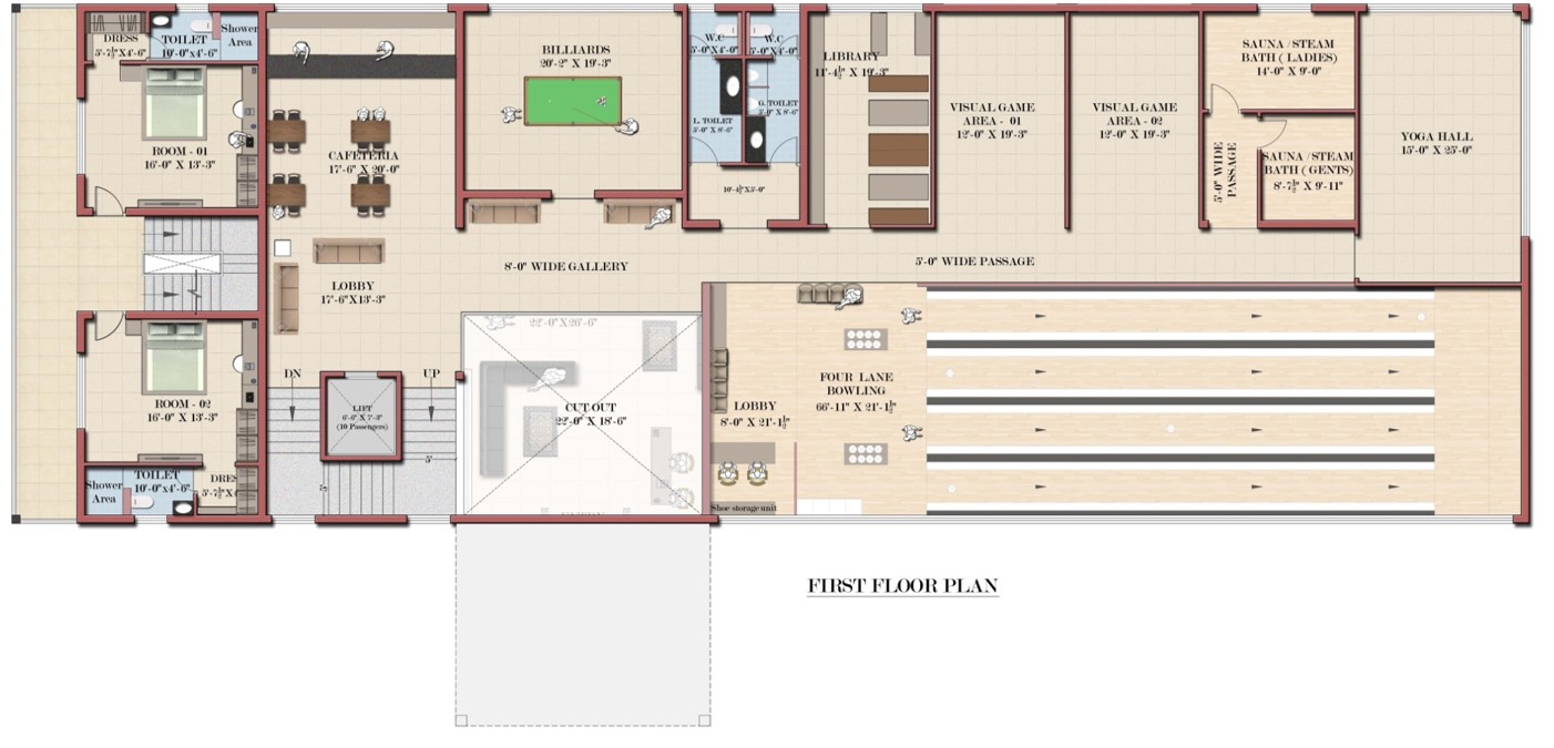 First Floor: Cafeteria, Billiards, Visual Games, Spa, Guest Rooms and Much awaited Bowling Game.