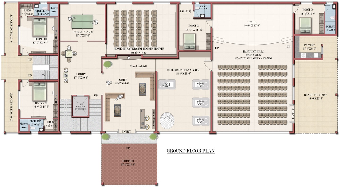 Ground Floor: Table Tennis, Fully Equiped Home Theatre, Children Indoor Play area, Banquet hall, Guest Rooms.