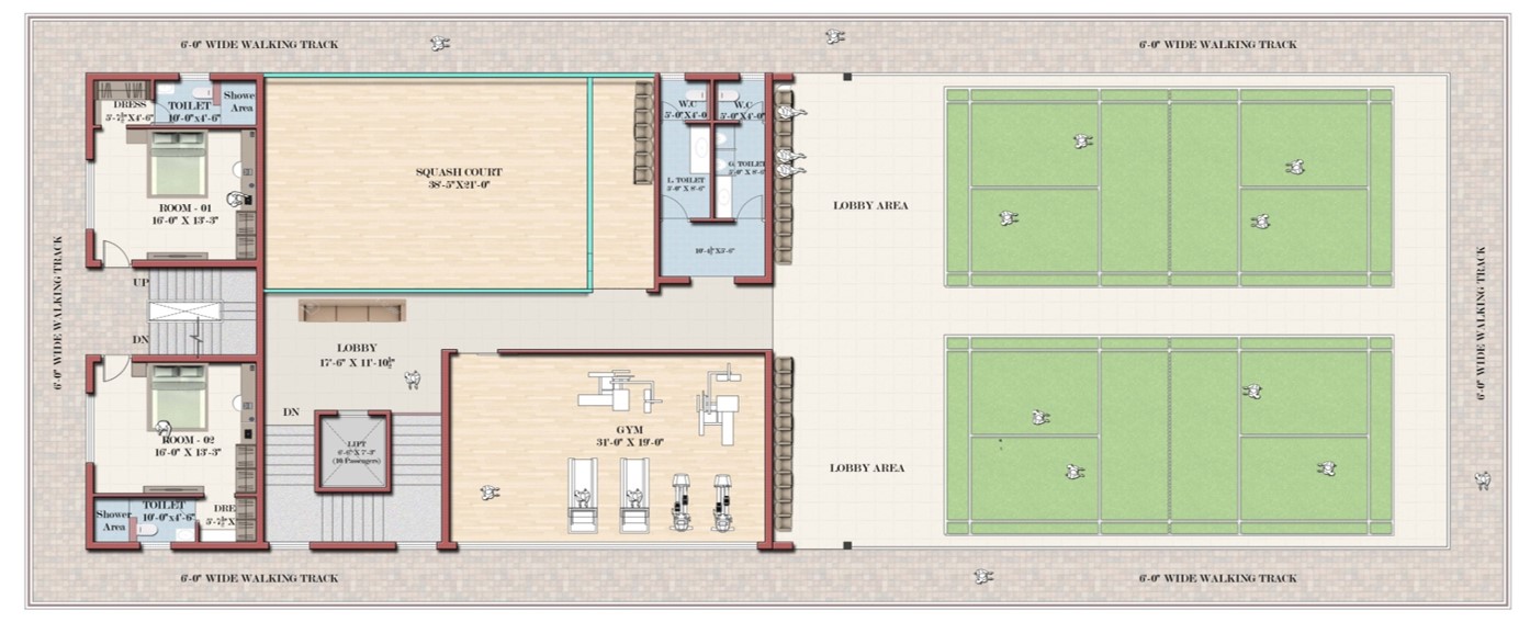 Second Floor: Squash Court, Shuttle Court, Multi Gym hall and Specialy desigined Walking Track